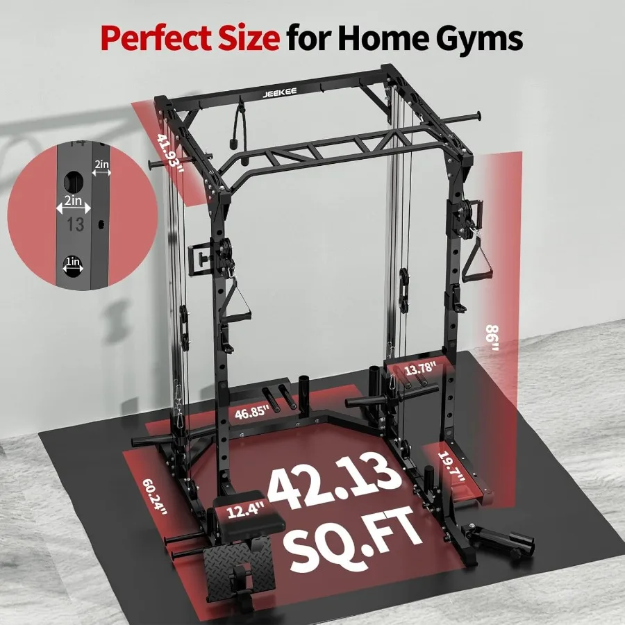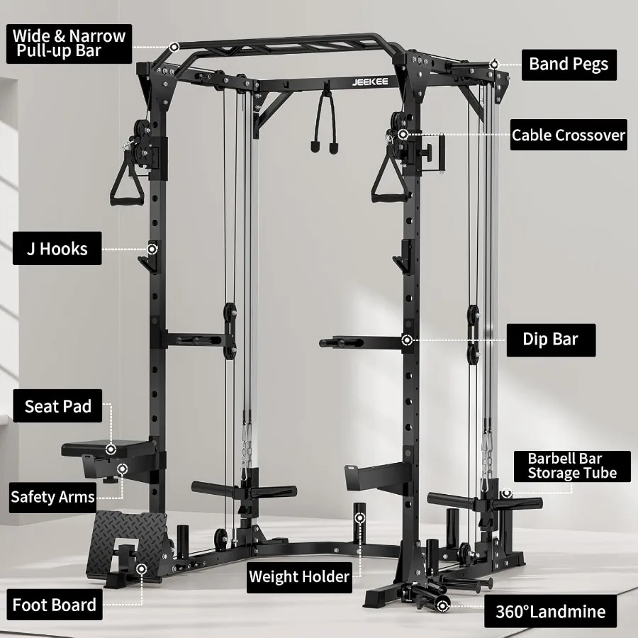 - đȘăall in one home gymă: JEEKEE power racks for home gym combine the functions of squat rack, weighted pull down machine, power tower, cable machine, pull up rack, etc., which can meet your diversified workout needs. Cage size: 60.24"LĂ46.85"WĂ86"H, can be used by multiple family members at the same time, perfect for home gym.