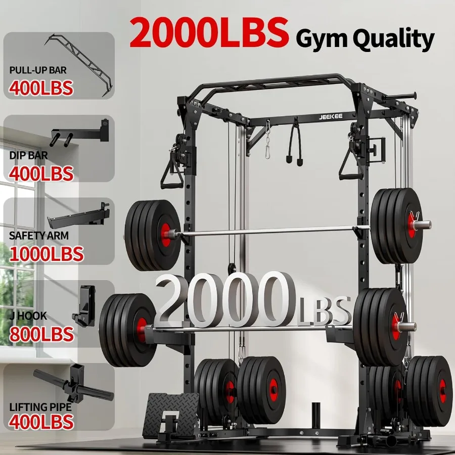 - đȘăPrecision & Durable Pulley Systemă: JEEKEE power cage home gym uses a precision bearing pulley system + high quality rubber cable balls for durability. The solid steel pulleys can hold up to 500 lbs and provide you with a smooth and fluid motion experience.