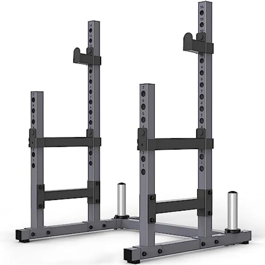 - 【 Wide Application 】- 14 positions for J hooks and 7 positions for bumpers allow you to perform various exercises at the level you feel comfortable. The height of highest position for J-hooks is 137.5cm(54”) ,and for bumpers is 86cm(33.8”). This item can be also called a bench press rack, we can also use it together with a weight bench to do barbell bench press workouts. Absolutely a great choice for your home gym!