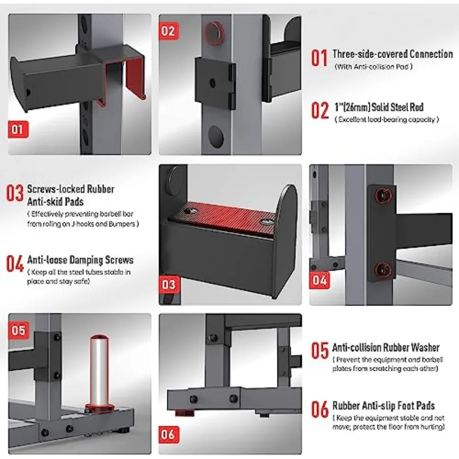 - 【 Stable and Safe 】 - This power rack for home gym is designed with lots of features to keep the users safe during workout: 1, total 4 bumpers, 2 for each side (other half racks only use 1 or 0), offer safer and more stable workout experience; 2, Screw-locked anti-slip pads for J hooks and bumpers, the barbell bar will not slip and keep safe; 3, Solid steel perforation of the holes to install the J hooks and bumpers to the columns, and three-full-sided wrapped with steel, super stable and never wobble.